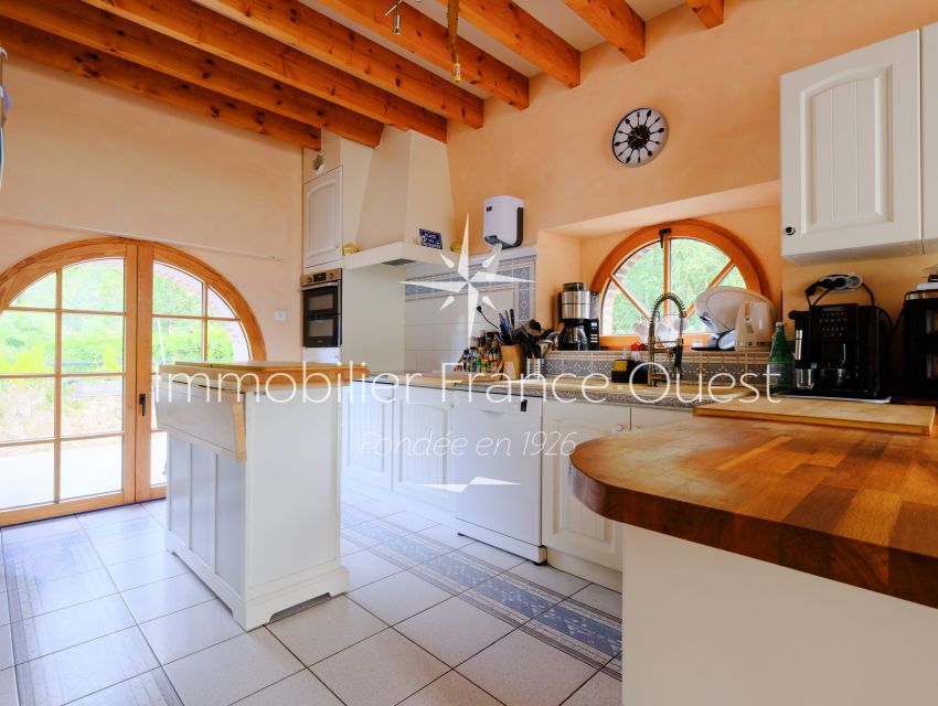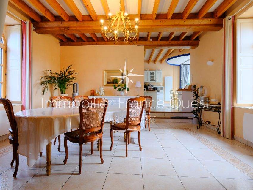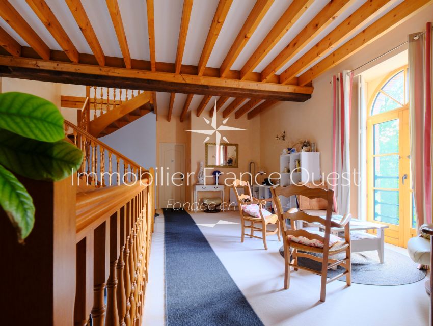 Derrière ses pierres pleines d'histoire, le rez-de-chaussée dévoile un vaste salon lumineux de 64 m2, un espace bureau, un séjour, une cuisine aménagée avec son bow window au-dessus de la rivière.