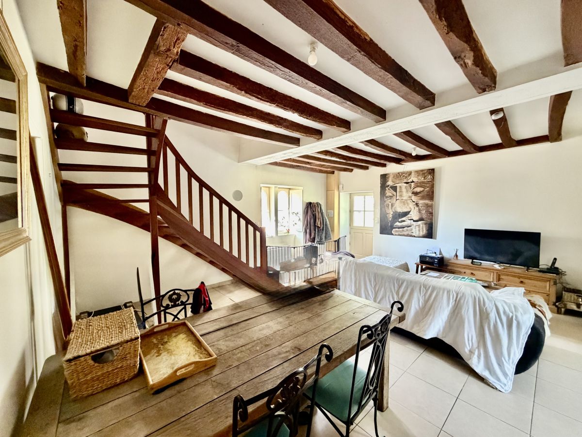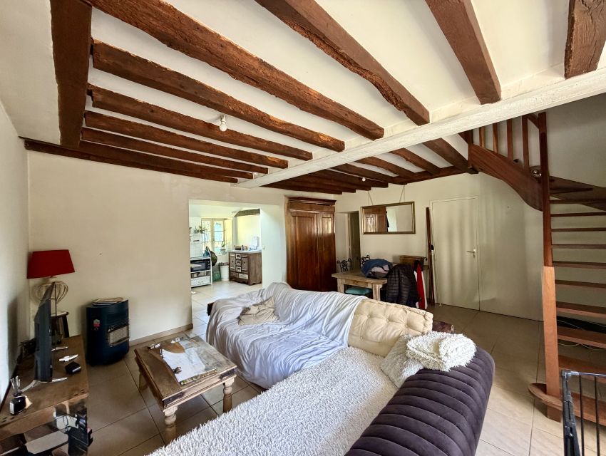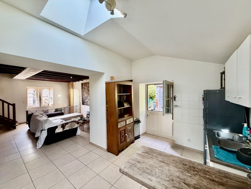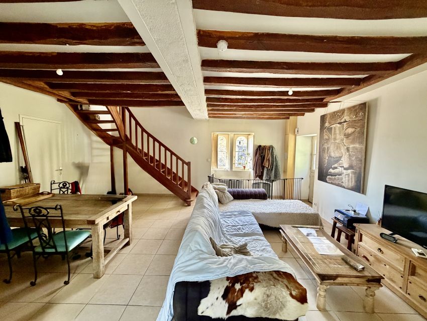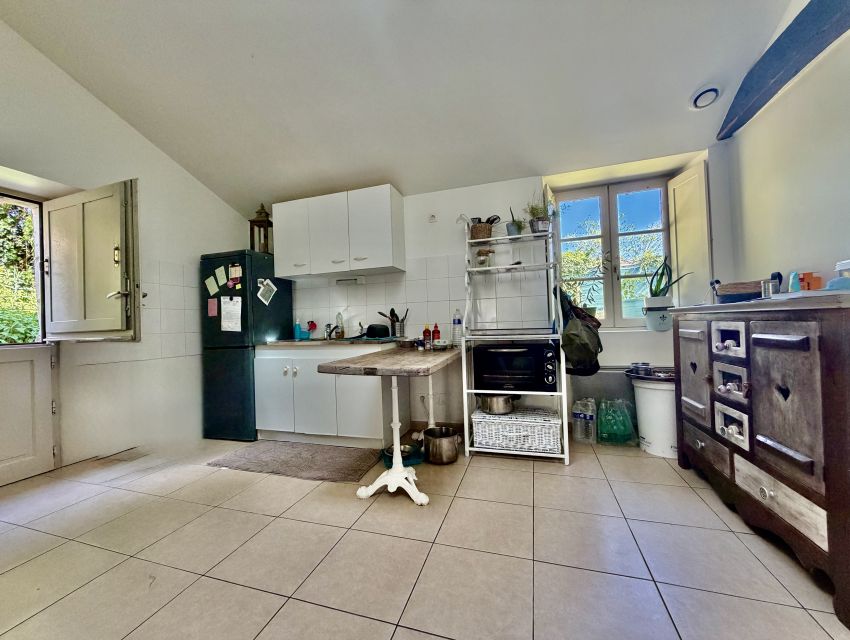 Dès l’entrée, la maison d’habitation dévoile des volumes généreux et une atmosphère chaleureuse. Entièrement rénovée en 2011 avec des prestations de qualité (électricité, plomberie, sanitaires, isolation, menuiseries bois double vitrage…), elle propose au rez-de-chaussée une belle cuisine conviviale avec arrière-cuisine, un vaste salon-séjour lumineux ouvert sur la cour, deux chambres de plain-pied ainsi qu’une salle d’eau.