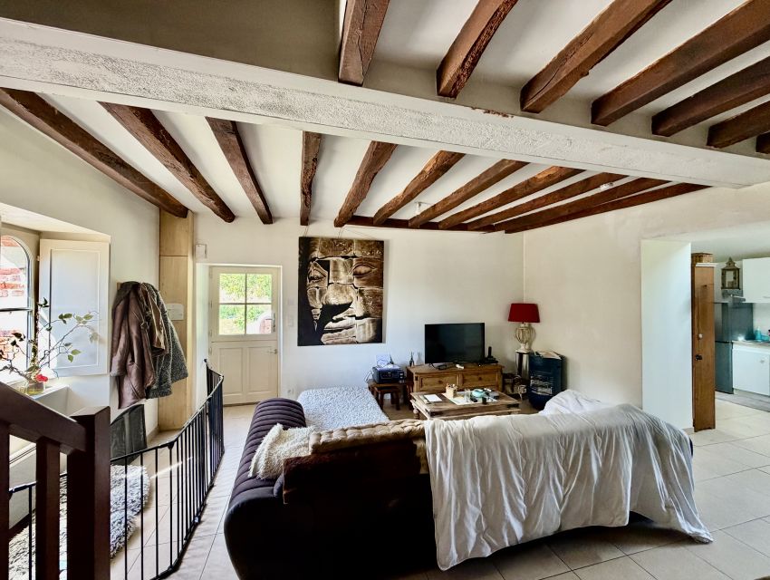 La maison séduit également par ses éléments authentiques : portes fermières, pierre de tuffeau, fenêtres arrondies et œil-de-bœuf, qui lui confèrent tout son charme d’époque tout en offrant un confort actuel.