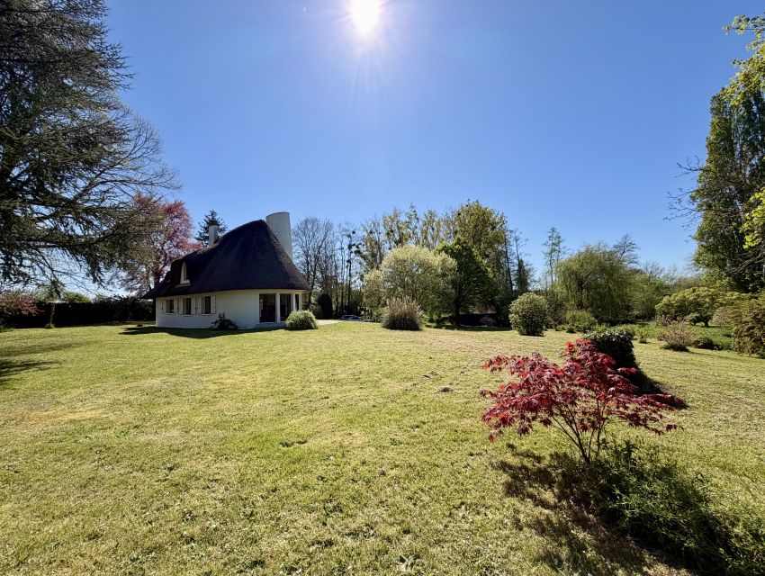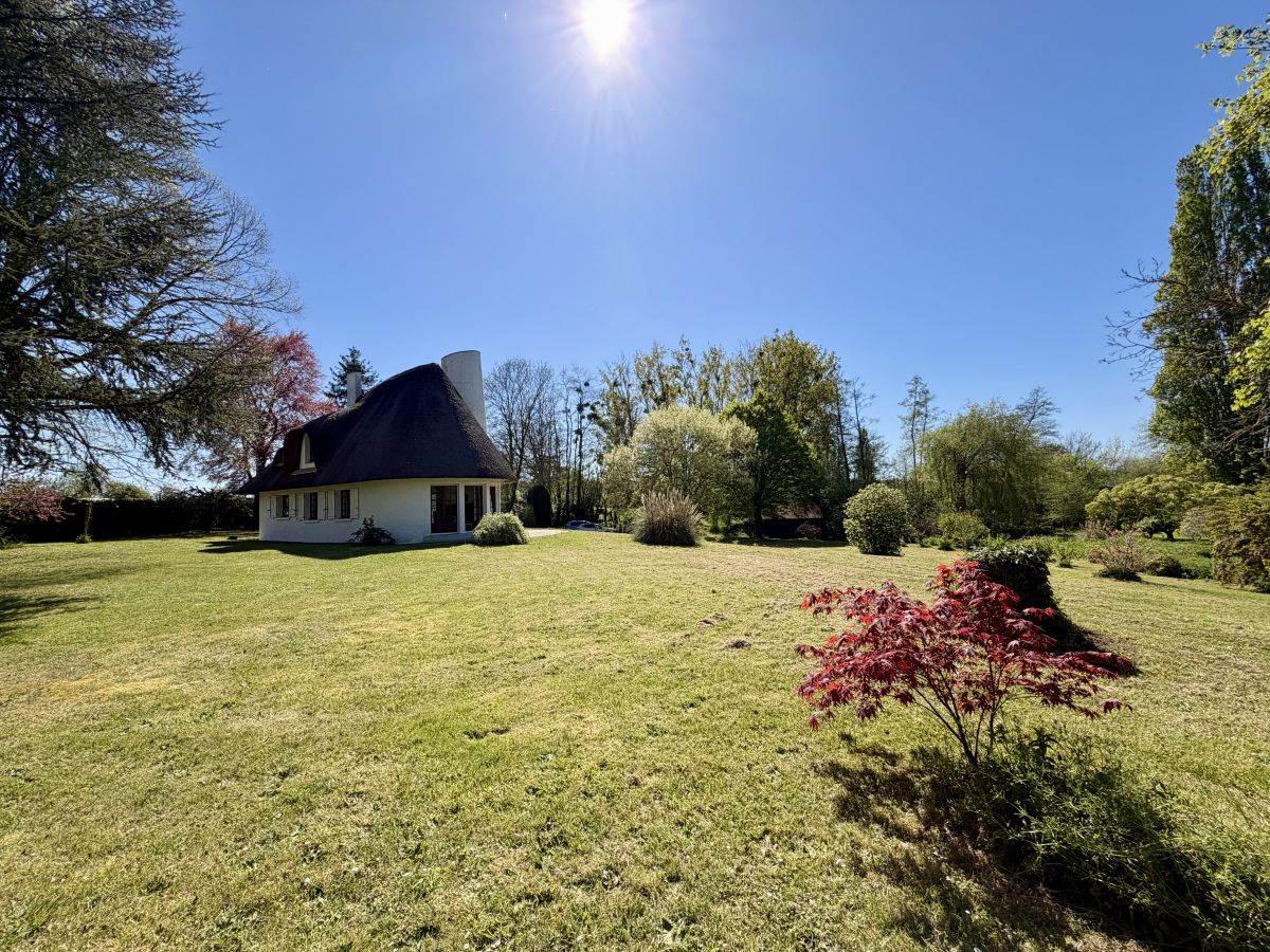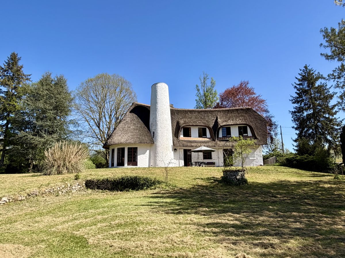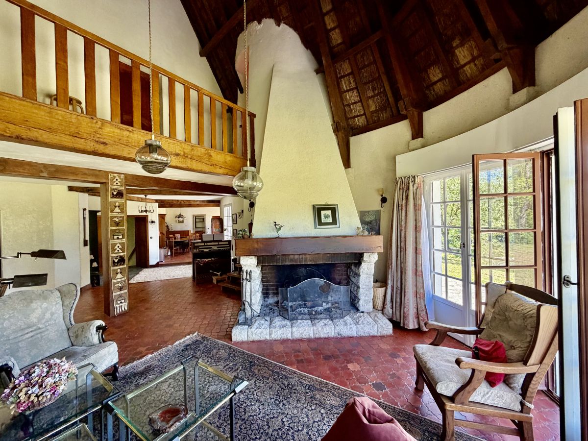 La maison développe de beaux volumes répartis sur deux niveaux. Dès l’entrée, le charme opère : vous découvrirez un vaste salon baigné de lumière, sublimé par une superbe cheminée et un toit cathédrale laissant apparaître la structure du toit de chaume, conférant à l’ensemble une atmosphère chaleureuse et unique. De larges ouvertures offrent une connexion permanente avec l’extérieur et la nature environnante.