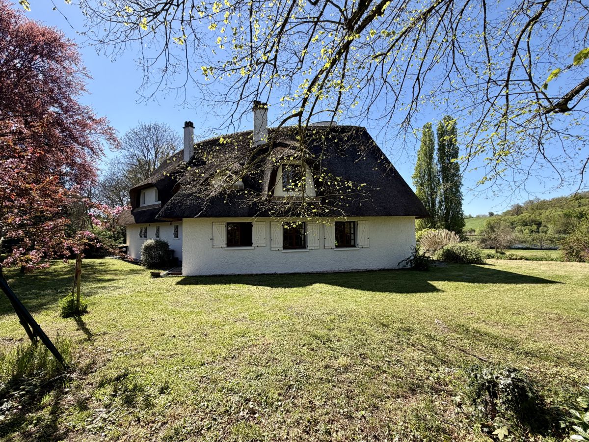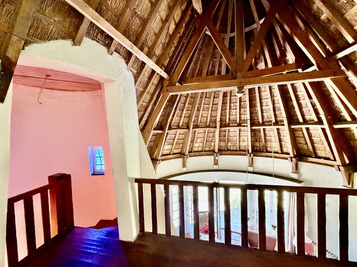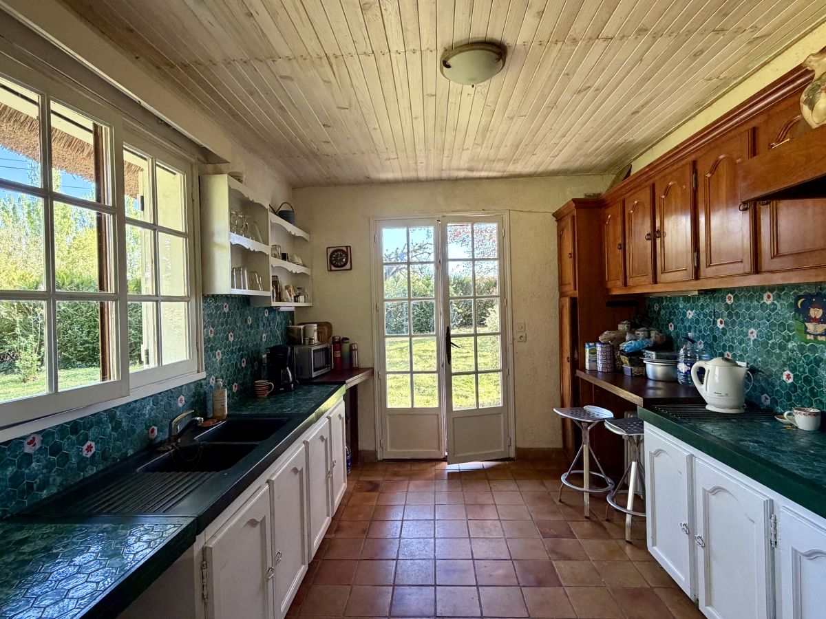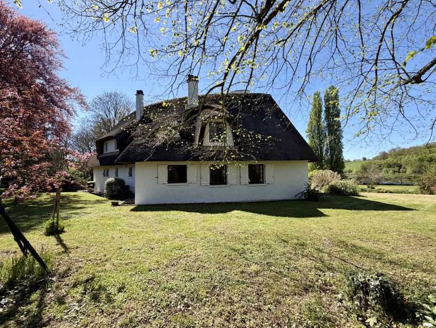 La maison développe de beaux volumes répartis sur deux niveaux. Dès l’entrée, le charme opère : vous découvrirez un vaste salon baigné de lumière, sublimé par une superbe cheminée et un toit cathédrale laissant apparaître la structure du toit de chaume, conférant à l’ensemble une atmosphère chaleureuse et unique. De larges ouvertures offrent une connexion permanente avec l’extérieur et la nature environnante.