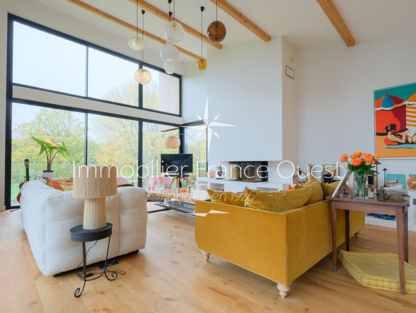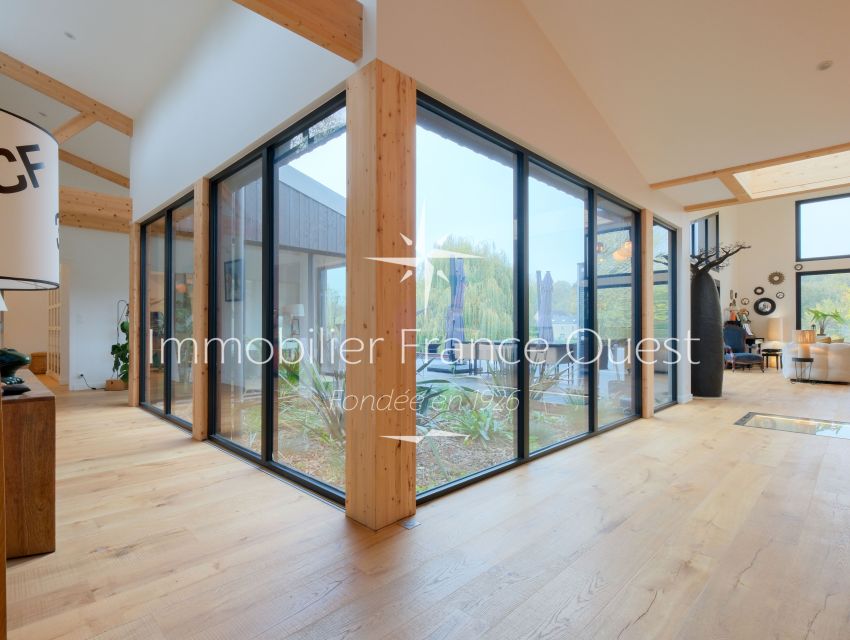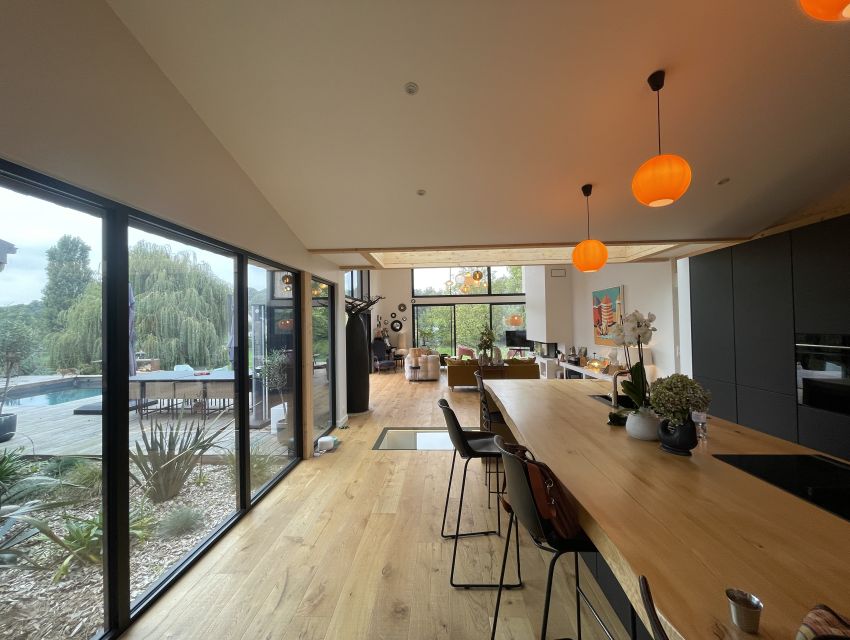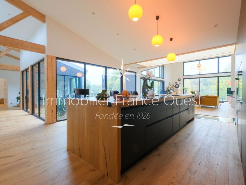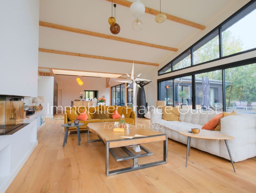 Dès l’entrée, le ton est donné : volumes généreux, luminosité omniprésente et finition irréprochable. La villa d’architecte, pensée pour épouser son environnement, s’ouvre largement sur un parc paysager descendant jusqu’à la rivière Sarthe, offrant un cadre de vie rare et apaisant.